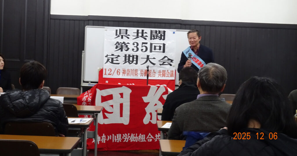 高市首相の台湾有事発言に端を発した中国外交問題が注目される中、12月6日、横浜・開港記念会館会議室で神奈川県共闘は、第35回定期大会を開催しました。 大会議長に全国一般神奈川の清水さんを選任し大会は始まりました。議事運営は、式次第に沿って行われ、吉良副議長の開会の挨拶に始まり、来賓挨拶には、活動で忙しい中大会に駆け付けていただいた渡邊全労協議長、解雇撤回を求め闘うJAL争議団の近村さん、神奈川交流事務局員風呂橋さんから連帯の挨拶をいただきました。